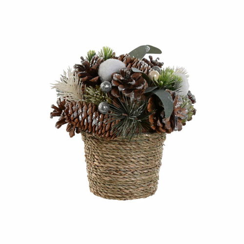 Centre decoratiu nadalenc en cistella compost per piques naturals, branques verdes i detalls enfarinats, decorat amb boles i elements en tons platejats i blancs. Presentat en una cistella trenada que aporta un toc rústic i elegant. Mides: 19x19x19cm.