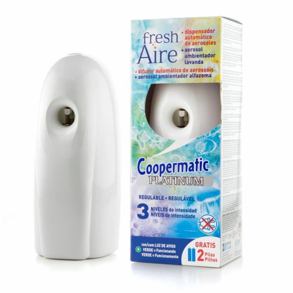 El sistema FRESH AIRE COOPERMATIC PLATINUM es un dispensador automático de aerosoles que no necesita conexión a la corriente eléctrica, permitiéndo personalizar cualquier ambiente de forma más cómoda. FRESH AIRE COOPERMATIC PLATINUM funciona con 2 pilas LR 6 / 1,5 V y se regulable, disponiendo de 3 intervalos de difusión de la fragancia: 9-18-36 min. Tiene interruptor encendido / apagado y aviso luminoso verde indicador de Funcionamiento. La Duración de aerosol es de 60 días (a intervalos de 36 min.).