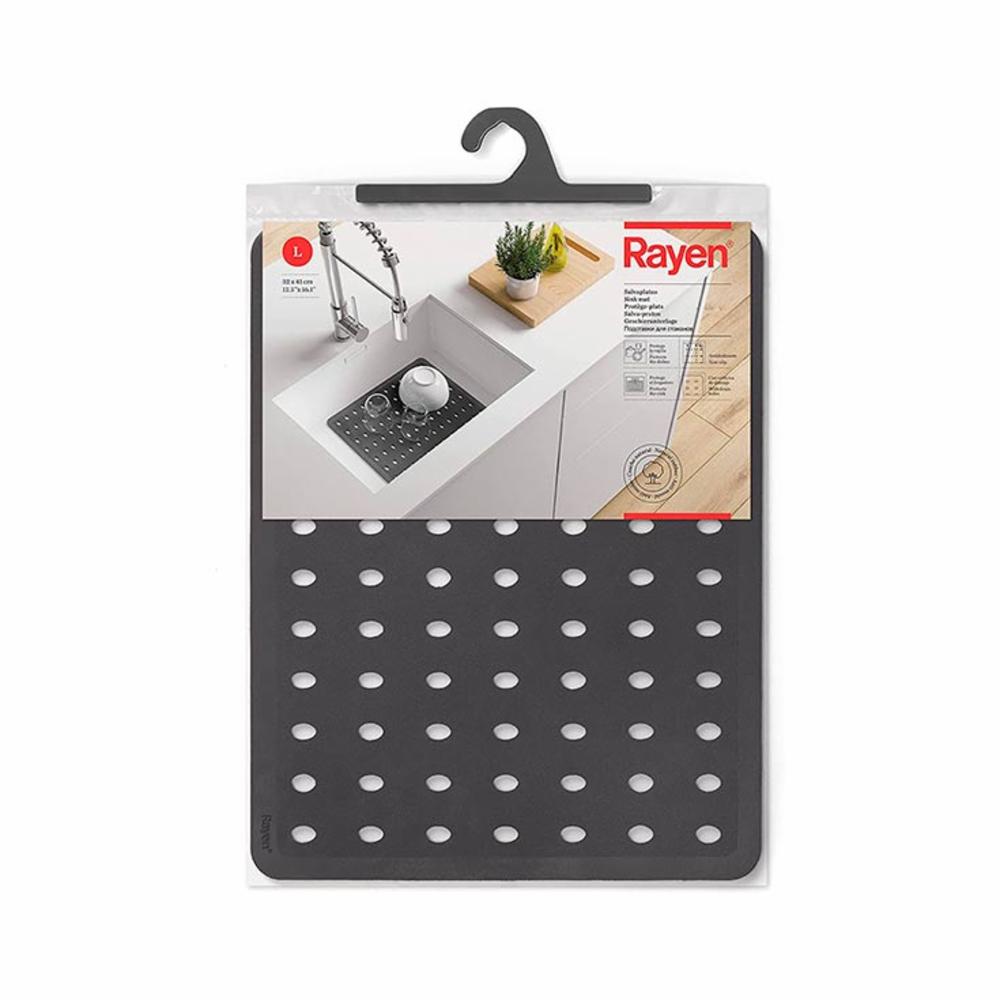 Estalvis per l'aigüera 32x41 cm diàmetre. Color negre. Per l'aigüera de la teva cuina. Protegeix els plats, vaixelles, porcellanes o copes de vidre per evitar que es trenquin; a més protegeix la teva pica de cops i esgarrapades. Disposa de forats per eliminar laigua de la catifa del tot. Fabricada amb cautxú natural i és anti-floridura; a més, és un producte ecològic per al medi ambient. Resistent als greixos i detergents domèstics. Resistent a l'aigua bullint. Material antilliscant.