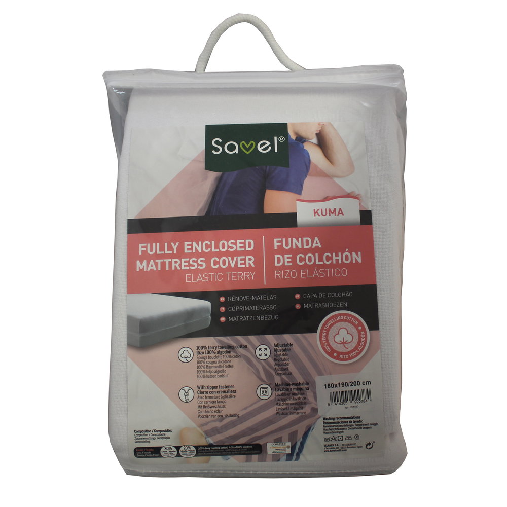 Funda matalàs Ris Elàstic confeccionada amb ris 100% cotó aportant una gran absorció a la peça. A més, gràcies a la seva cremallera protegeix de forma integral el matalàs. 180cm.