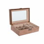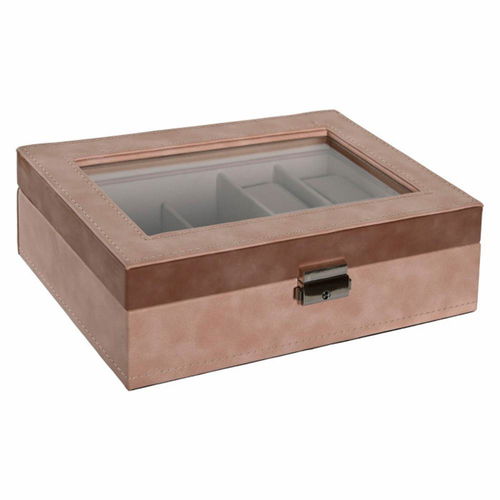 Fabricada amb acabat en to beix i tapa superior transparent que permet visualitzar el contingut sense obrir-la. Inclou compartiments interns amb farciment per mantenir els rellotges protegits i ordenats. Disposa de tancament metàl·lic segur, ideal per a ús personal o com a regal. Mides: 16x25x7,5 cm.