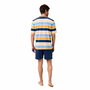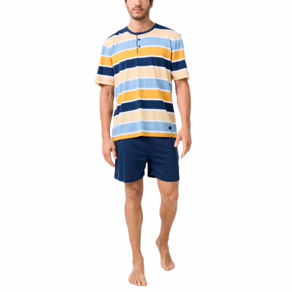 Pijama de punt amb samarreta de ratlles amples en blau marí. Inclou tapeta frontal i petit brodat marí al pit que aporta caràcter i detall. Els pantalons curts marins completen un conjunt sòlid i equilibrat. El seu teixit de cotó de 140 g ofereix lleugeresa, suavitat i gran confort en climes càlids. 100% Cotó