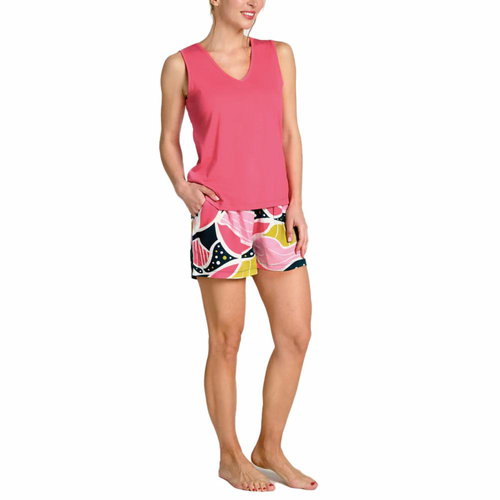 Pijama de 2 peces per a dona compost per una samarreta de tirants amples bàsica en color rosa i uns pantalons curts. Teixit lleuger i fresc, perfecte per a l'estiu. Samarreta: 100% Cotó Pantalons: 100% Viscosa
