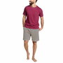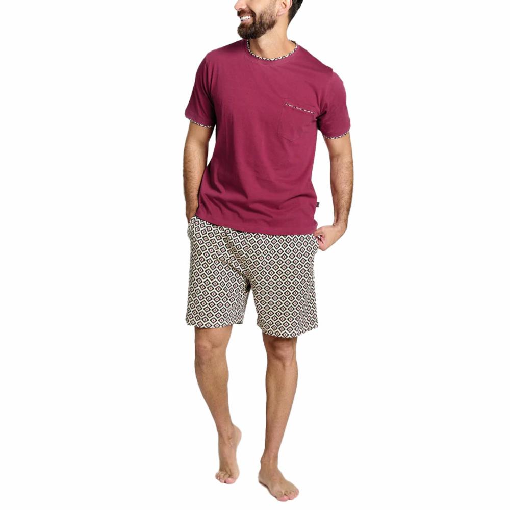 Conjunt de pijama per a home compost per samarreta de màniga curta en to granat, amb butxaca al pit i detalls en contrast al coll, mànigues i butxaca, més pantaló curt estampat a joc per a un look coordinat i actual. 100% Cotó