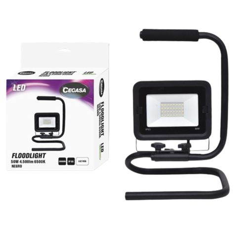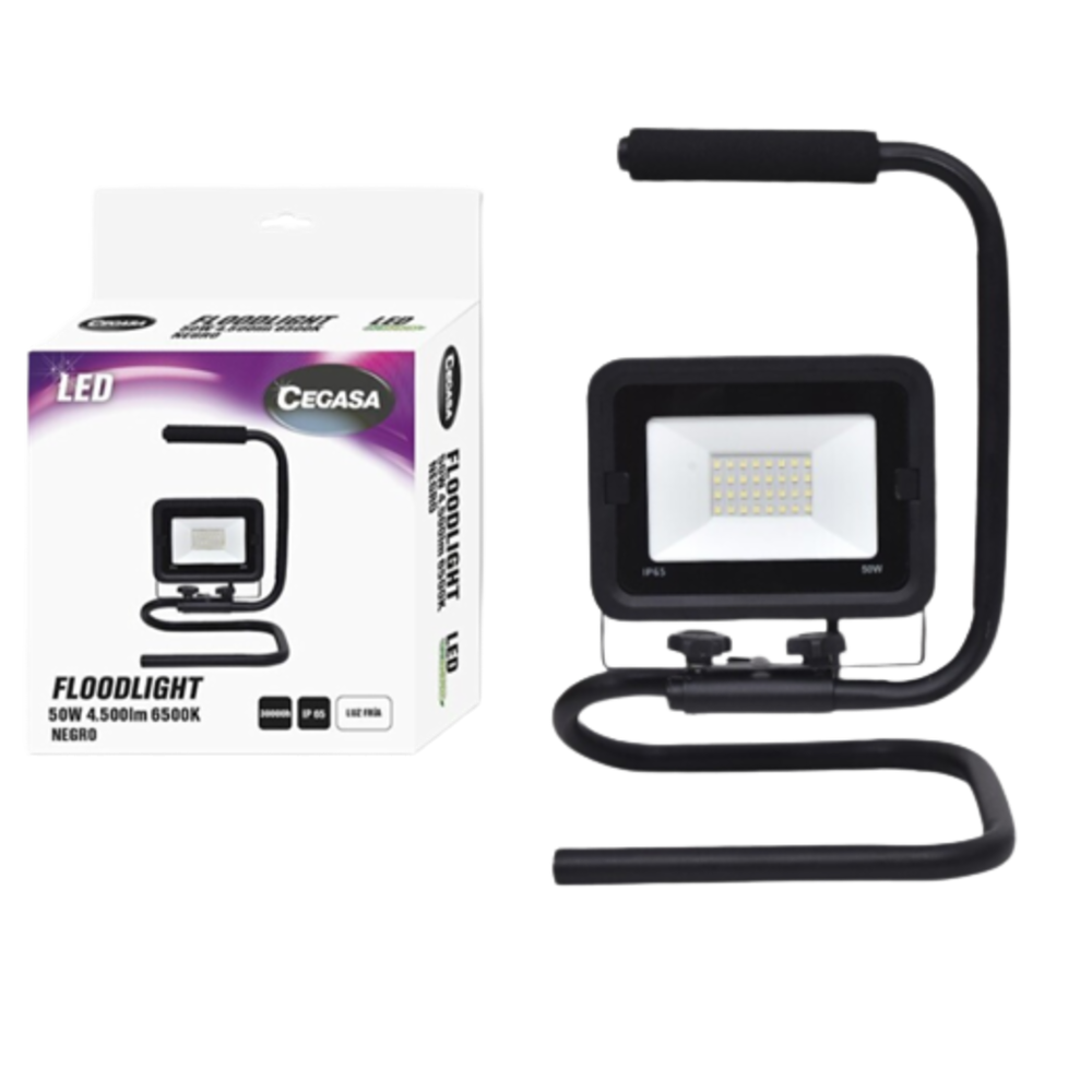 El Focus Projector LED amb Suport de 50 W i 4500 lúmens de la marca CEGASA és una excel·lent opció per a il·luminació exterior eficient i duradora. Inclou un suport metàl·lic per al seu transport i col·locació en diferents zones.