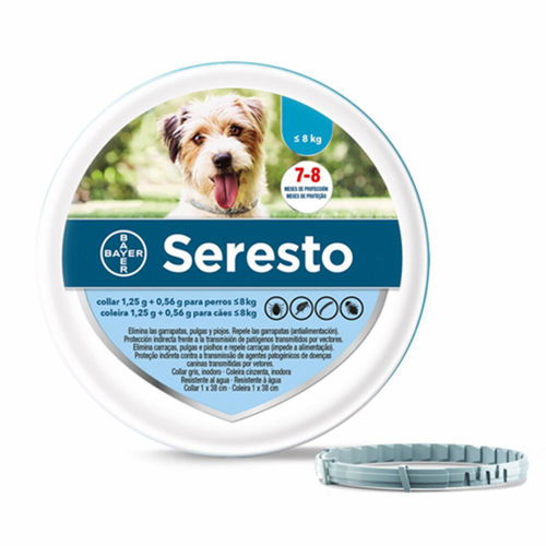 Seresto és un collaret antiparasitari que acaba amb les puces del teu gos i les seves larves de l'entorn, i repel·leix i elimina les paparres. Allibera els principis actius d'una forma controlada, a dosis molt baixes, i ofereix al teu gos fins a 8 mesos de protecció contra puces i paparres. A més, els seus estudis clínics mostren una disminució significativa del risc de transmissió de Leishmania per flebòtoms en gossos tractats respecte als no tractats. Collaret de 38cm per a gossos de fins a 8 quilo?s.