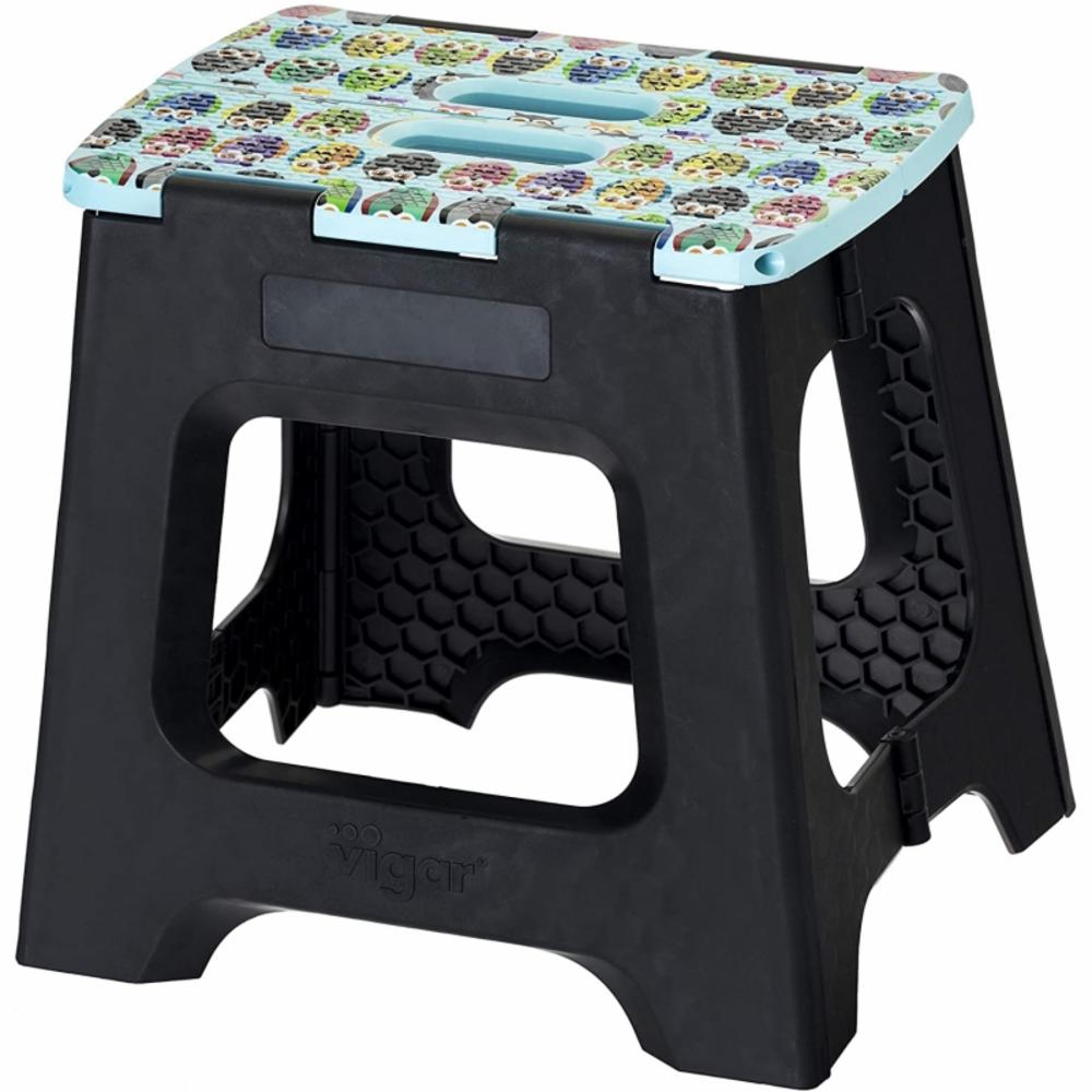 Tamboret plegable molt pràctic per accedir a petites altures de la casa i fàcil de guardar. Es plega i desplega amb un simple gest. Escalon plegable amb estampat de mussols a la part superior que suporta un pes màxim de 150Kg / 330lb. Dimensions: 32x27x27 cm