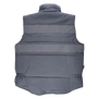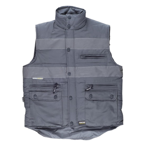Chaleco acolchado de cuello alto con cintas reflectantes. Cierre de cremallera de nylon oculta por solapa de corchetes. Un bolso de pecho interior con cierre de cremallera. Dos bolsos interiores con cierre de cremallera en los costados. Dos bolsos laterales con fuelle y cartera de corchetes. Un bolso de pecho de plastón con cierre de velcro en el interior. Dos cintas reflectantes en pecho y espalda. Sisas ajustables. Elástico en los laterales de la cintura.