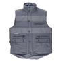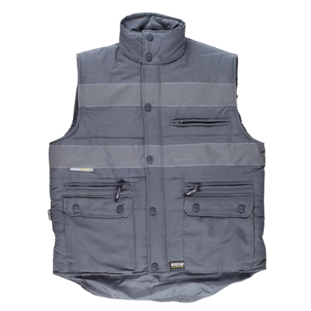 Chaleco acolchado de cuello alto con cintas reflectantes. Cierre de cremallera de nylon oculta por solapa de corchetes. Un bolso de pecho interior con cierre de cremallera. Dos bolsos interiores con cierre de cremallera en los costados. Dos bolsos laterales con fuelle y cartera de corchetes. Un bolso de pecho de plastón con cierre de velcro en el interior. Dos cintas reflectantes en pecho y espalda. Sisas ajustables. Elástico en los laterales de la cintura.