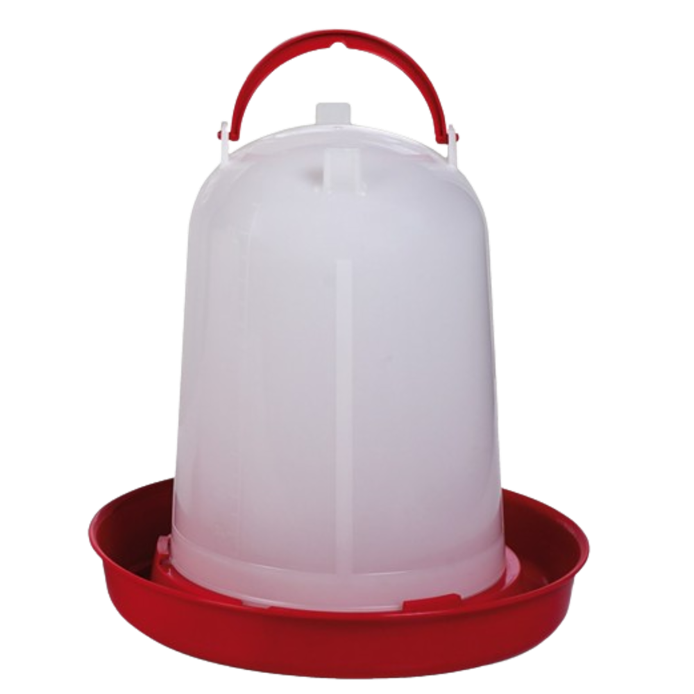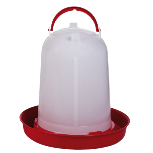 Bebedero para pollos que consta de un plato de plástico en la parte inferior con capacidad de 8 litros.