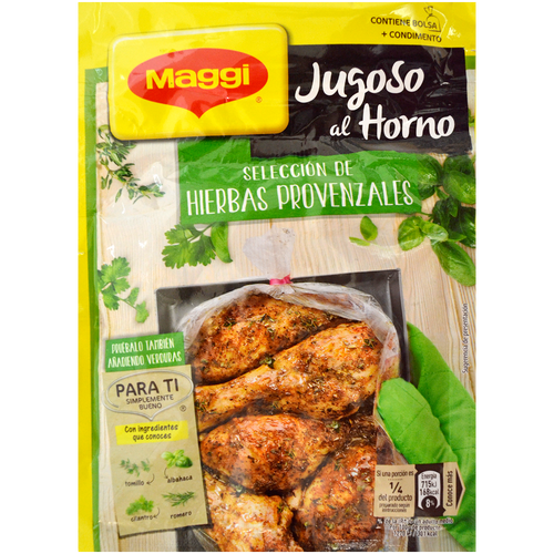 Con Jugoso al Horno de MAGGI prepararás una auténtica receta de pollo al horno con una selección de hierbas provenzales de manera fácil, práctica y sin ensuciar prácticamente nada. Esta receta contiene únicamente ingredientes naturales que conoces y utilizas en tu cocina: hortalizas, especias y plantas aromáticas. La receta de hierbas provenzales está elaborada con una exquisita combinación de especias tales como pimentón, cilantro, jengibre así como la mejor selección de plantas aromáticas como la albahaca, tomillo y romero.