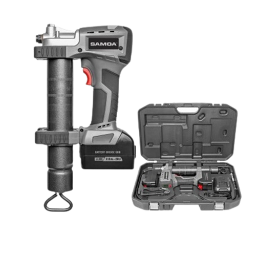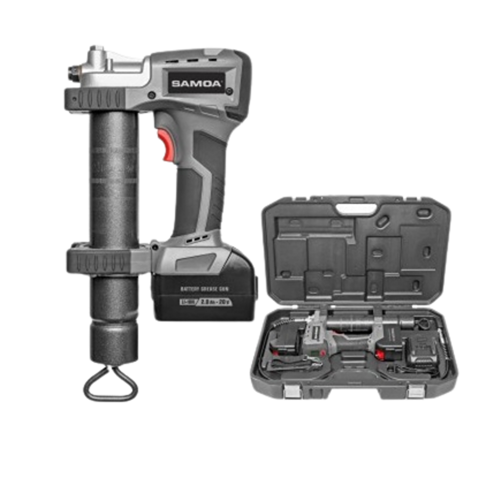 Pistola de engrase con motor elctrico alimentado por batera recargable de 20V Li-ION. Depsito de grasa 500 cc para utilizacin con grasa a granel o cartucho con mbolo de compactacin accionado por resorte. La batera Li-ION es ligera, ms respetuosa con el medio ambiente, tiene un mayor rendimiento a bajas temperaturas y menor descarga cuando la batera no est en funcionamiento. Incluye cargador de batera 230 V monofsico, 1 batera Li-ION recargable, extensin flexible de 1,1 m con boquilla hidrulica y maletn de transporte de alta calidad.