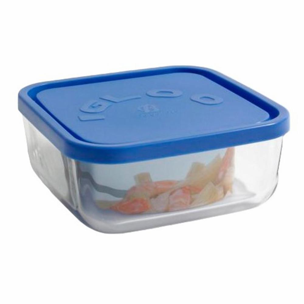 Tarro de vidrio cuadrado con tapadera de plástico azul de la línea IGLOO de la marca Borgonovo. IGLOO es una línea de envases de vidrio para la conservación de alimentos en neveras. Se caracterizan por la practicidad, la higiene, la transparencia y el reciclaje. Puede utilizarlo en el microondas y puede lavarlo en el lavavajillas.