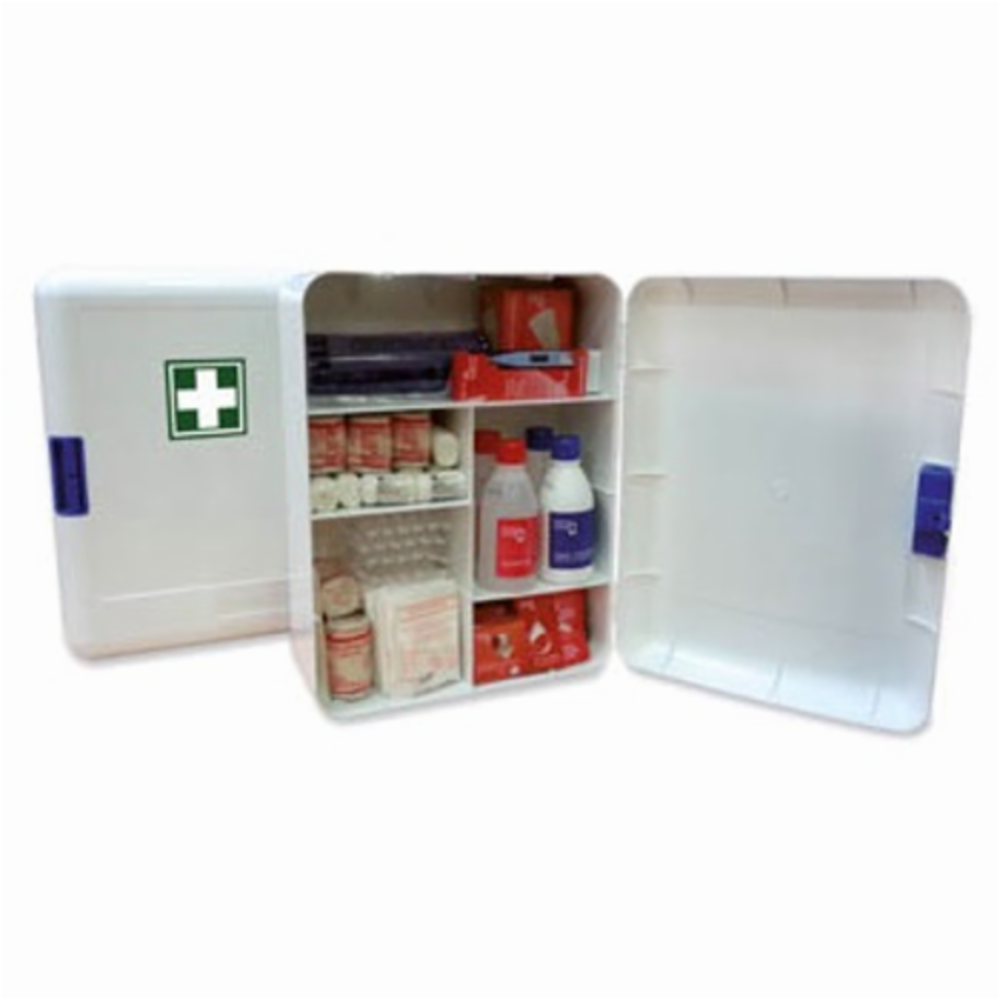 Botiqun de primeros auxilios para anclar en pared, con llave, cuatro puntos de anclaje, de plstico inyectado.Dispone de hasta 7 compartimentos en su interior. Uno de llos mvil, que permite adaptar a sus necesidades las dimensiones de los compartimentos.Dotado de cierre por presin que a su vez incorpora cerradura de seguridad mediante llave de plstico.Se entrega con pegatina de Cruz Verde homologada.