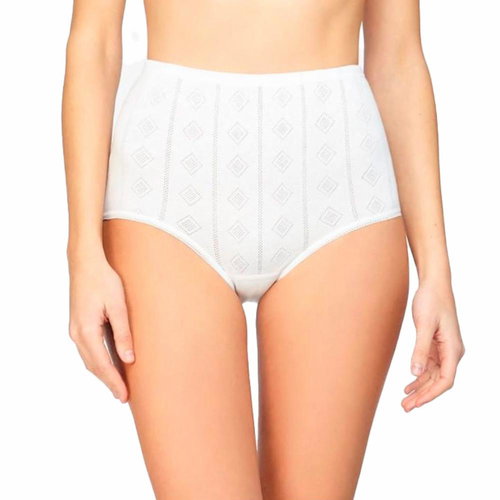 Braguita clásica alta Avet de algodón. Diseño fino con dibujo jacquard. En la cintura tienen goma cubierta y puntilla suave en los camales. Además, dispone de refuerzo de rizo en la entrepierna 100% algodón, muy suave e higiénico. Es una prenda ideal para pieles sensibles. Disñada y fabricada en España. 100% algodón peinado