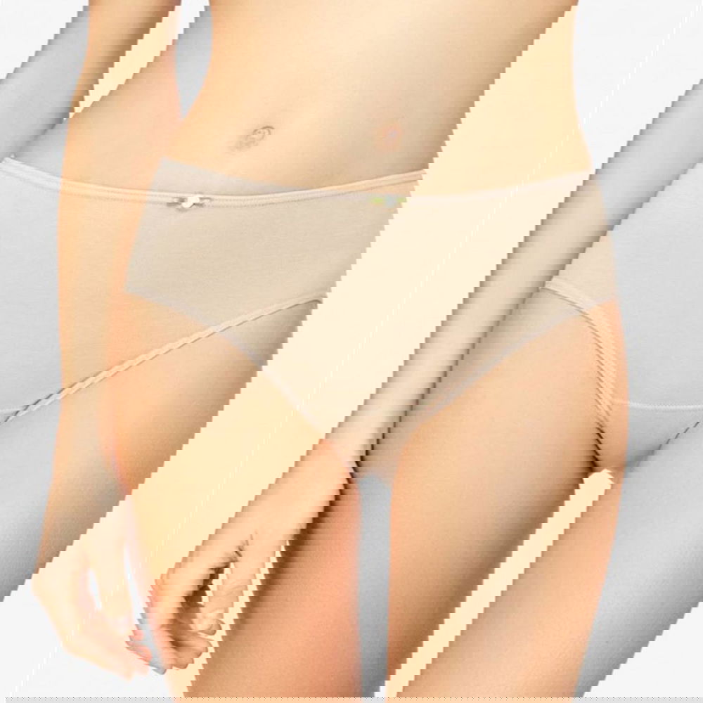Braga de corte básico en color vison, 95% algodón, lleva elástico en la cintura y detalle de flor delante.