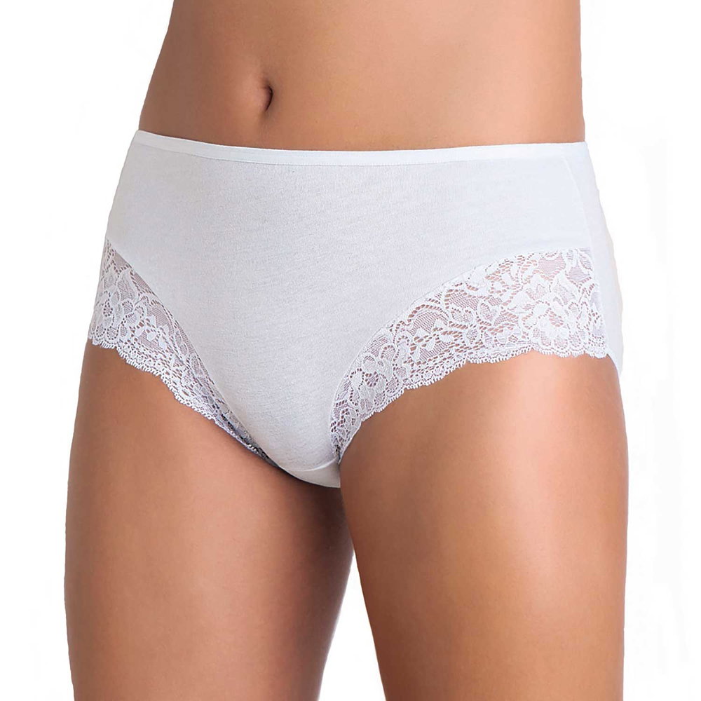 Algodón bielástico, textura fina y suave, braguita lisa con encaje en costados, de tamaño midi, normal en altura por debajo de ombligo, con rombo higiénico antibactérico y antiolores, es muy elástica y adaptable, no marca ni molesta el encaje, costuras planas, composición 82% algodón, 12% poliamida, 6% elastano.