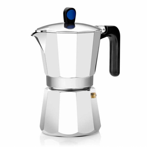 Cafetera de aluminio con fondo difusor adaptado para todo tipo de fuegos incluído los de inducción, recubrimiento interior antiadherente, no limpiar en lavavajillas.