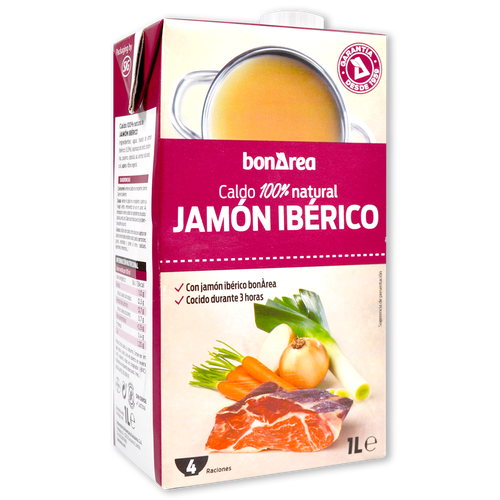 Caldo líquido de elaboración culinaria, resultado de la ebullición en agua de huesos de jamón ibérico y hueso con magro de cerdo blanco, con una mezcla de hortalizas (zanahoria, puerro, cebolla, col blanca y apio), obteniendo un caldo con sabor agradable y característico del jamón ibérico. Producto listo para su consumición (agitar antes de abrir), ideal para consomé, sopa (hirviendo los ingredientes deseados como pasta o arroz), o como base para hacer guisos. Servir caliente.