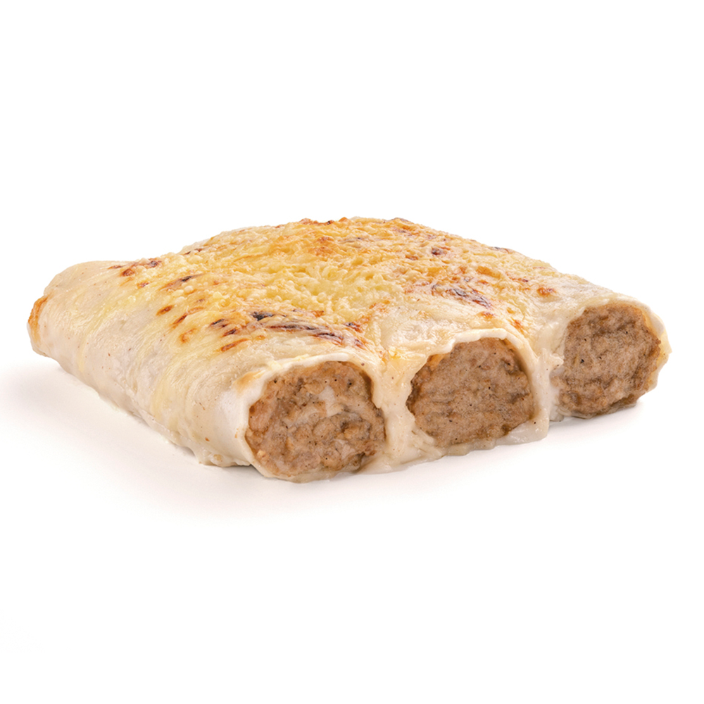Producto cocinado elaborado con láminas de oblea rellenas de carne de cerdo, ternera y pollo, con aceite y cebolla, recubierto con una salsa de bechamel y queso.
