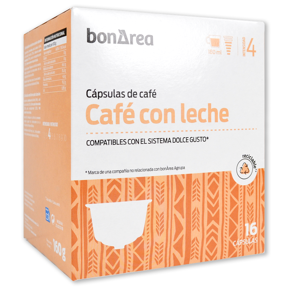 Cápsulas de café soluble natural molido (100%) mezcladas con leche en polvo. Compatibles con el sistema Dolce Gusto.
