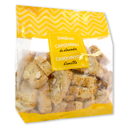 Carquinyolis de almendra presentados en práctica bolsa de 250g.