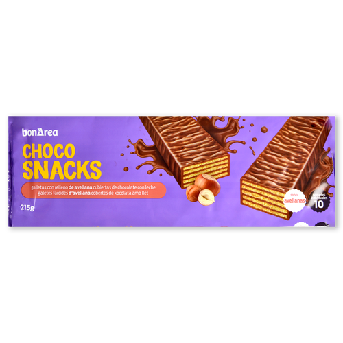 Producto formado por obleas alternadas con capas intermedias de relleno con sabor avellana, bañado con cobertura de chocolate con leche. Ideal para picar a media mañana o como merienda.