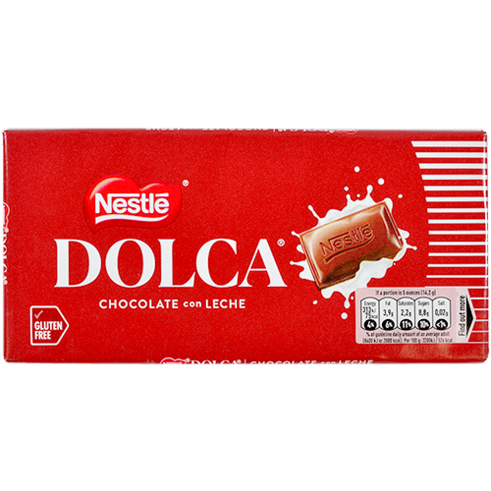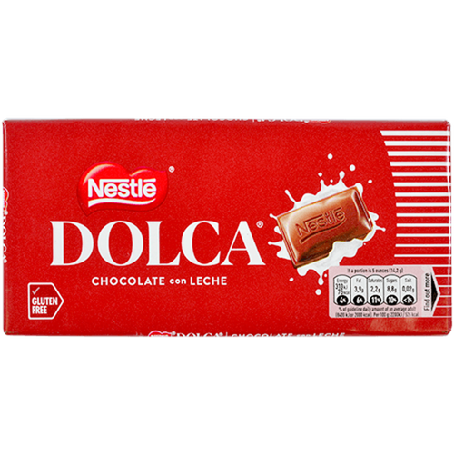 Tableta de chocolate con leche Nestlé Dolca. Un chocolate con leche cremoso para todos los gustos y apto para una dieta sin gluten.