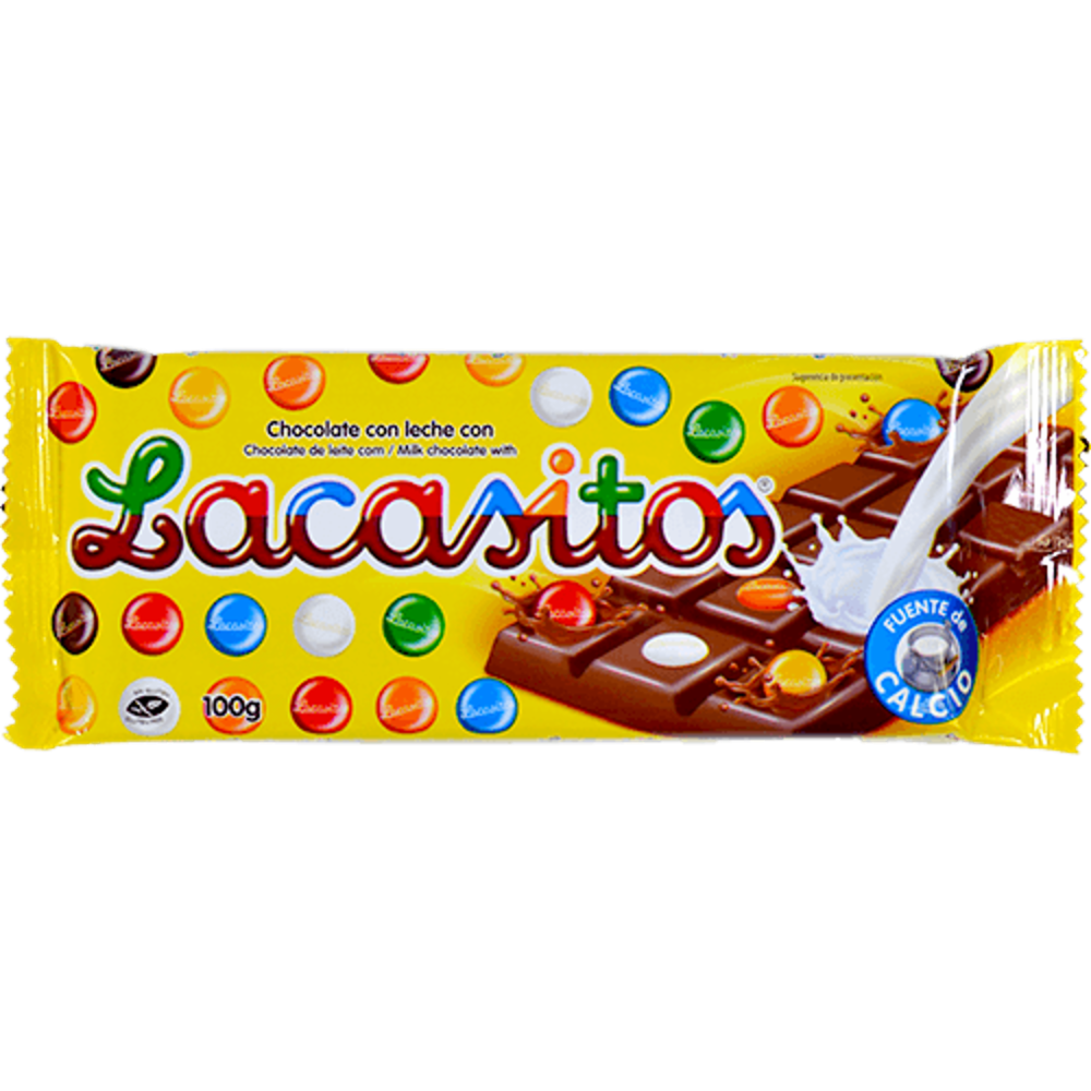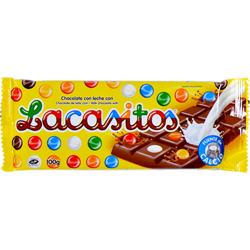 CHOCOLATE CON LECHE EXTRAFINO (82%) CON GRAGEAS DE CHOCOLATE CON LECHE RECUBIERTAS DE AZÚCAR COLOREADO (18%).