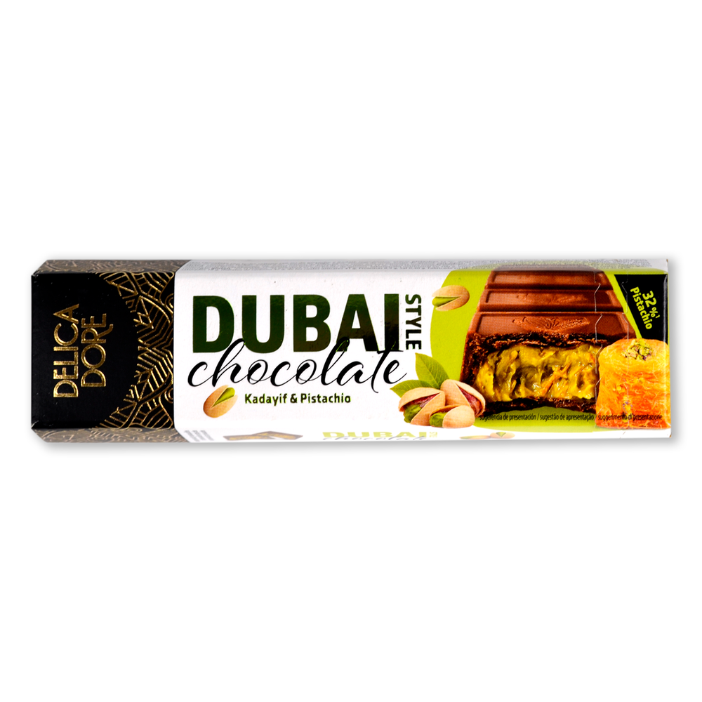 Chocolate con LECHE relleno de PISTACHOS (50 %) con Kadayif. Ingredientes: azúcar, PISTACHOS16 %, grasas vegetales (karité, palma), manteca de cacao, LECHE entera en polvo, suero en polvo (de LECHE), Kadayif 5 % (harina de TRIGO, agua, almidón de maíz, aceite de girasol, sal), pasta de cacao, LECHE desnatada en polvo, pasta de AVELLANAS, grasa LÁCTEA, emulgente: lecitinas, sal, aroma natural de pistacho con otros aromas naturales (contiene PISTACHOS), espirulina (extracto de espirulina, aceite de girasol, trehalosa*), aroma natural, pasta de CACAHUETE. Chocolate con leche: sólidos de cacao 31 % mínimo, sólidos de leche 20 % mínimo. Puede contener otros FRUTOS DE CÁSCARA, HUEVOS, SOJA y otros cereales que contengan GLUTEN. *La trehalosa es una fuente de glucosa.
