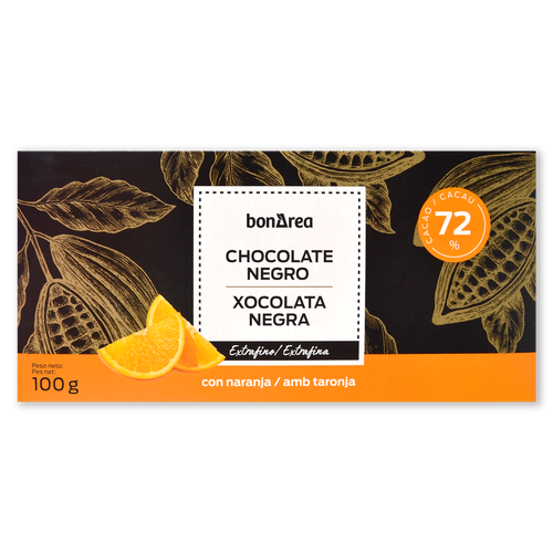 Chocolate negro extrafino 72% cacao con trocitos de naranja, presentado en tableta de 10 porciones. De sabor básicamente amargo, con un punto de acidez y dulzor y con toques de vainilla. Ideal para desayunos y meriendas o para picar entre horas.