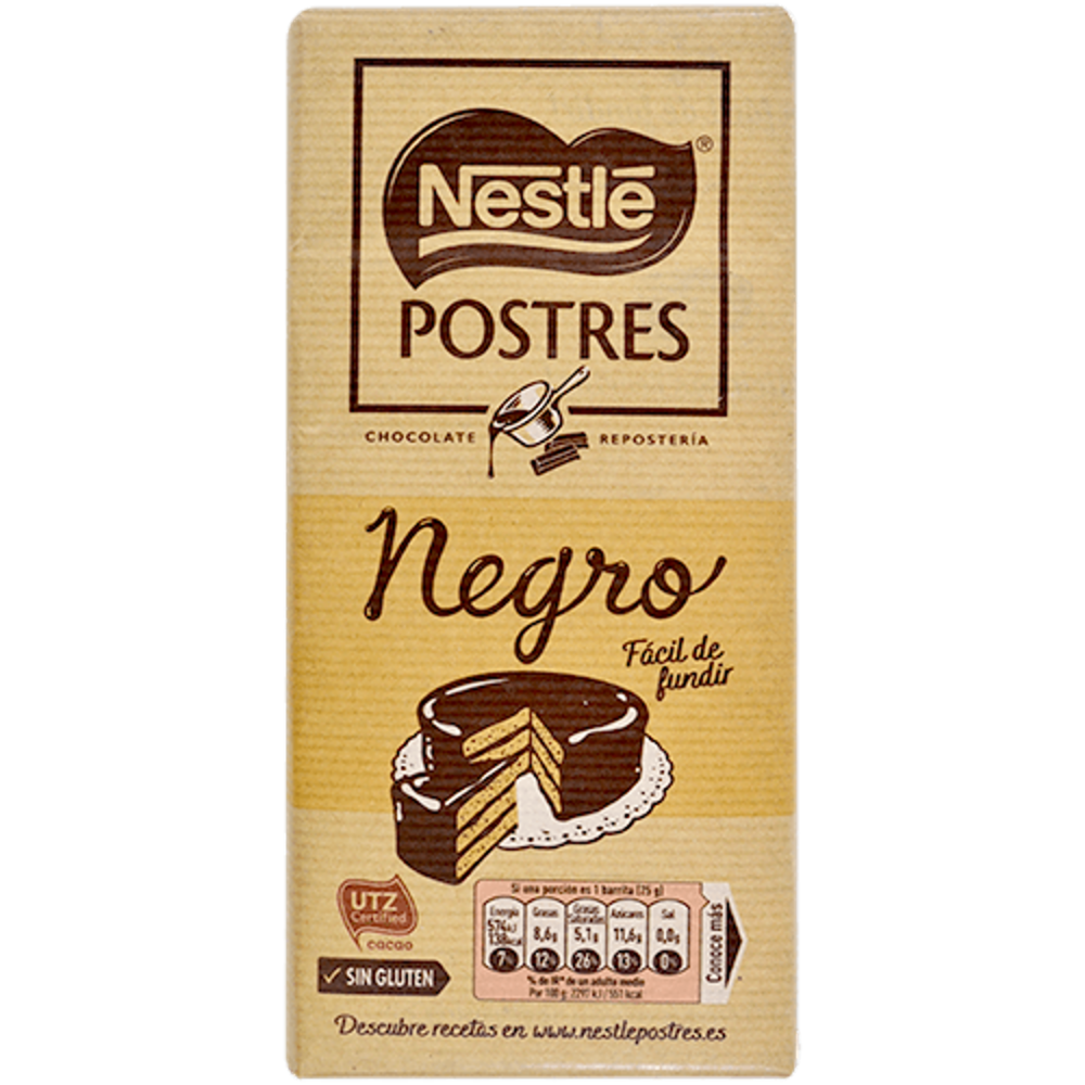 Esta tableta de chocolate NEGRO para repostería NESTLÉ POSTRES, está pensada para elaborar todo tipo de postres caseros y recetas con el intenso sabor del chocolate negro. El chocolate negro es perfecto para preparar tus postres favoritos y los de toda la familia, ya que su sabor intenso es perfecto para deleitar todo paladar. A diferencia del resto de tabletas del mercado, NESTLÉ POSTRES se caracteriza por ser un chocolate fácil de fundir, con una textura y brillo incomparables que lo hacen ideal para todo tipo de coberturas de chocolate, rellenos e incluso un exquisito chocolate a la taza. El consumo de esta tableta de chocolate negro es apto para celíacos (chocolate sin gluten) y está elaborada con cacao sostenible certificado por UTZ y de alta calidad.