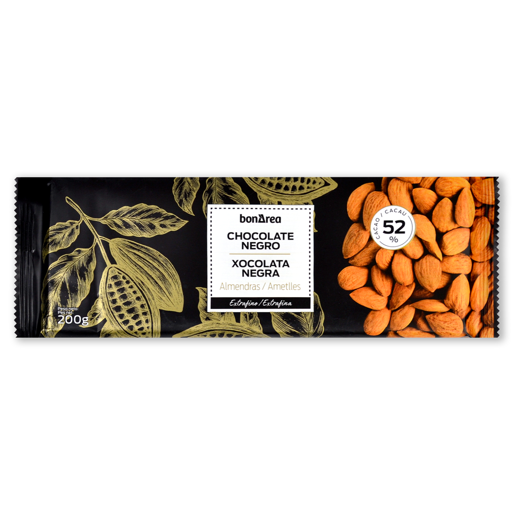 Chocolate extrafino negro con almendras enteras y/o troceadas. Presentado en tableta rectangular de 24 porciones. De sabor amargo típico del chocolate negro, junto con el sabor que proporciona el fruto seco. Ideal en desayunos y meriendas o para picar entre horas.
