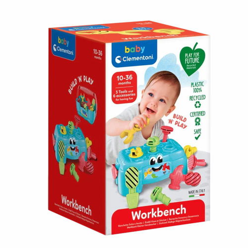 Una mesa de trabajo para jugar con tres herramientas, un martillo, un destornillador y una llave inglesa. Hay 6 accesorios, clavos, pernos y tornillos, para una experiencia rica e interactiva. Se convierte en una práctica caja de herramientas que el niño siempre puede llevar. Promueve la coordinación mano-ojo y las habilidades manuales. Edad recomendada +10 mesos.