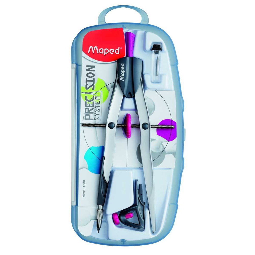 Compás MAPED con bigotera y sistema de ajuste de precisión. Incluye adaptador y caja para las minas.