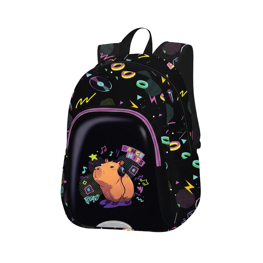 Mochila escolar de diseño moderno y muy colorido, decorada con un capibara animado y elementos gráficos inspirados en la música y el estilo urbano. Ofrece varios compartimentos y bolsillos para organizar fácilmente el material escolar. Capacidad 9L.