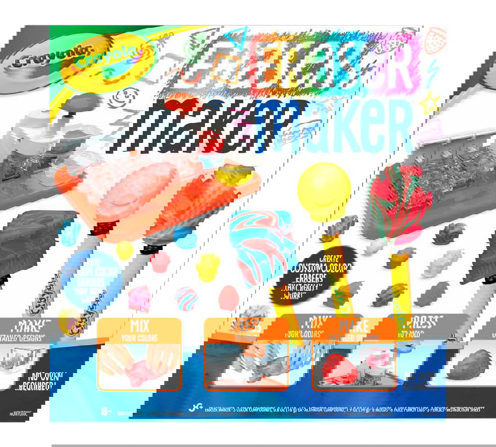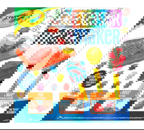 Con el Crayola Eraser Maker es fácil para los niños mezclar y moldear sus propias figuras de borrador coloridas y de temática caprichosa! Solo tienes que seguir las instrucciones paso a paso y en poco tiempo los niños podrán volver a la escuela con gomas de borrar geniales y coloridas para personalizar la parte superior de sus lápices. Edad recomendada +6 años.