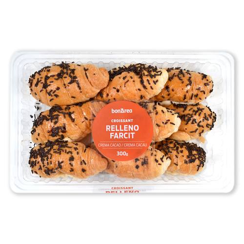 Masa esponjosa hojaldrada, rellena de crema de cacao. Sin grasas hidrogenadas. Ideal para desayunos y meriendas, acompañado de los zumos o la leche bonÀrea.