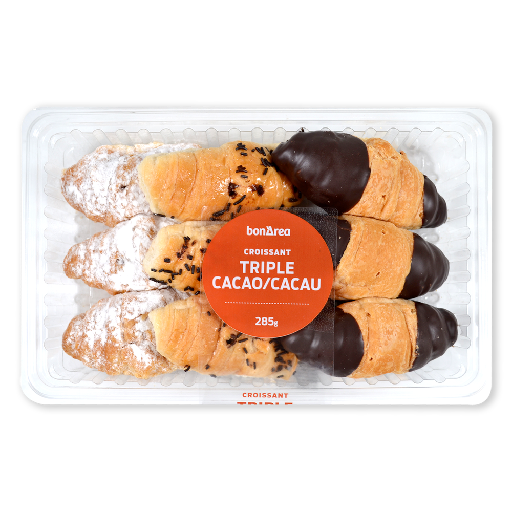Croissant inyectado con crema de cacao y decorado con azúcar glass: masa (57%): harina de TRIGO, agua, manteca de cerdo (manteca de cerdo, estabilizante: E-471 y antioxidante: E-320), azúcar, levadura, sal, mejorante (emulgentes (E-471, E-472e, E-481), harina de TRIGO, antiaglomerante (E-170), estabilizante (E-412), antioxidante (E-300) y enzimas) y conservador: E-282. Relleno de crema cacao (38%): azúcar, aceites vegetales (aceite refinado de girasol, palma), cacao en polvo desgrasado (2,8 %), emulgente (lecitina de girasol) grasa de palma y aromas. Recubrimiento de gel: preparado gelificado para recubrir (glucosa, acidulante E-330, E-331i, conservadores: E-211 y E-202, espesantes: E-407 y E-410, antioxidante E-300). Recubrimiento de azúcar glass (5%): azúcar, grasa de palma, antipelmazante: E-551 y antioxidantes: E-306 y E-304. Croissant con cobertura especial con grasa vegetal en los extremos y la parte inferior: masa (75%): harina de TRIGO, agua, manteca de cerdo (manteca de cerdo, estabilizante: E-471 y antioxidante: E-320), azúcar, levadura, sal, mejorante (emulgentes (E-471, E-472e, E-481), harina de TRIGO, antiaglomerante (E-170), estabilizante (E-412), antioxidante (E-300) y enzimas.) y conservador: E-282. Cobertura especial con grasa vegetal (25%): azúcar, grasa vegetal (palmiste, palma), polvo de cacao desgrasado (3,9 %), emulgentes (lecitina de girasol, E-476, E-492) y aroma. Croissant inyectado con crema de cacao y decorado con preparado gelificado y fideo de cobertura especial con grasa vegetal: masa (53%): harina de TRIGO, agua, manteca de cerdo (manteca de cerdo, estabilizante: E-471 y antioxidante: E-320), azúcar, levadura, sal, mejorante (emulgentes (E-471, E-472e, E-481), harina de TRIGO, antiaglomerante (E-170), estabilizante (E-412), antioxidante (E-300) y enzimas) y conservador: E-282. Relleno de crema cacao (38%): azúcar, aceites vegetales (aceite refinado de girasol, palma), cacao en polvo desgrasado (2,6 %), emulgente (lecitina de girasol) grasa de palma y aromas. Recubrimiento (12%): preparado gelificado para recubrir (glucosa,acidulantes E-330, E -331i, conservadores: E-211 y E-202, espesantes: E-407 y E-410, antioxidante: E-300) y fideo de cobertura especial con grasa vegetal (1,5 %) (azúcar, cacao desgrasado en polvo (0,3 %), grasa vegetal (palma, karité), emulgente: E-322, agentes de recubrimiento: E-414, E-904). Puede contener trazas de SOJA, HUEVO, MOSTAZA, LECHE, SULFITOS Y FRUTOS DE CÁSCARA.