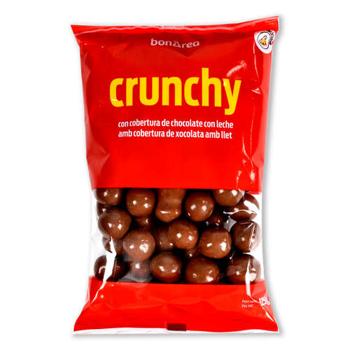 Cereales con cobertura de chocolate con leche, en forma de pequeñas bolas envasadas en bolsas de 70 g. ¡Deliciosos!