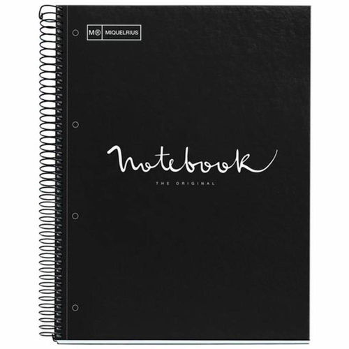 Cuaderno A4 Notebook 1 Cuadriculado Cuaderno de 80 hojas microperforadas con cuatro taladros y cuadrícula de 5 mm con encabezamiento y banda de color Cubiertas extra duras de cartón forrado de papel impreso y plastificado brillante en color negro. Producto MiquelRius.