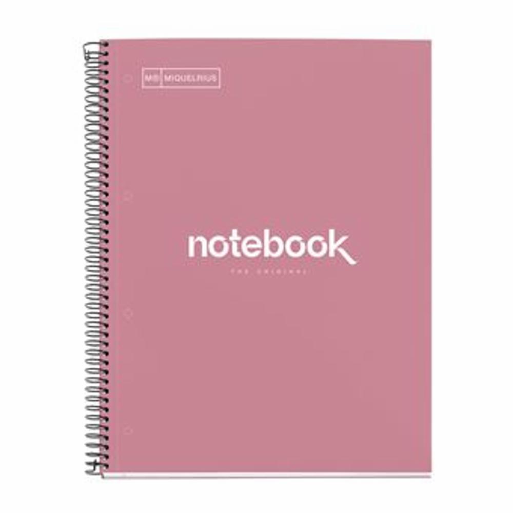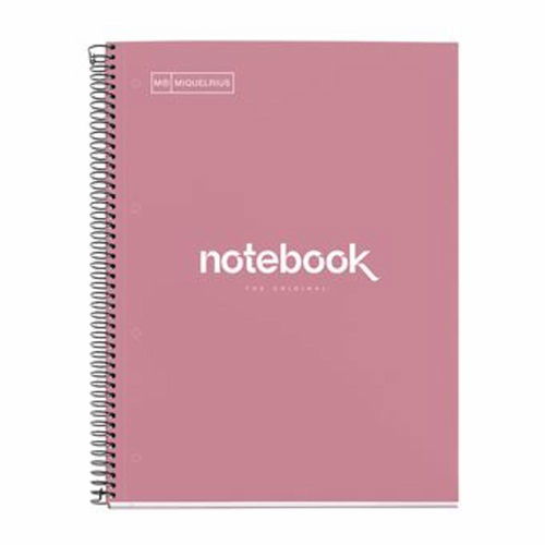 Cuaderno A4 Notebook 1 Cuadriculado Cuaderno de 80 hojas microperforadas con cuatro taladros y cuadrícula de 5 mm con encabezamiento y banda de color Cubiertas extra duras de cartón forrado de papel impreso y plastificado brillante en color rosa dust. Producto MiquelRius.