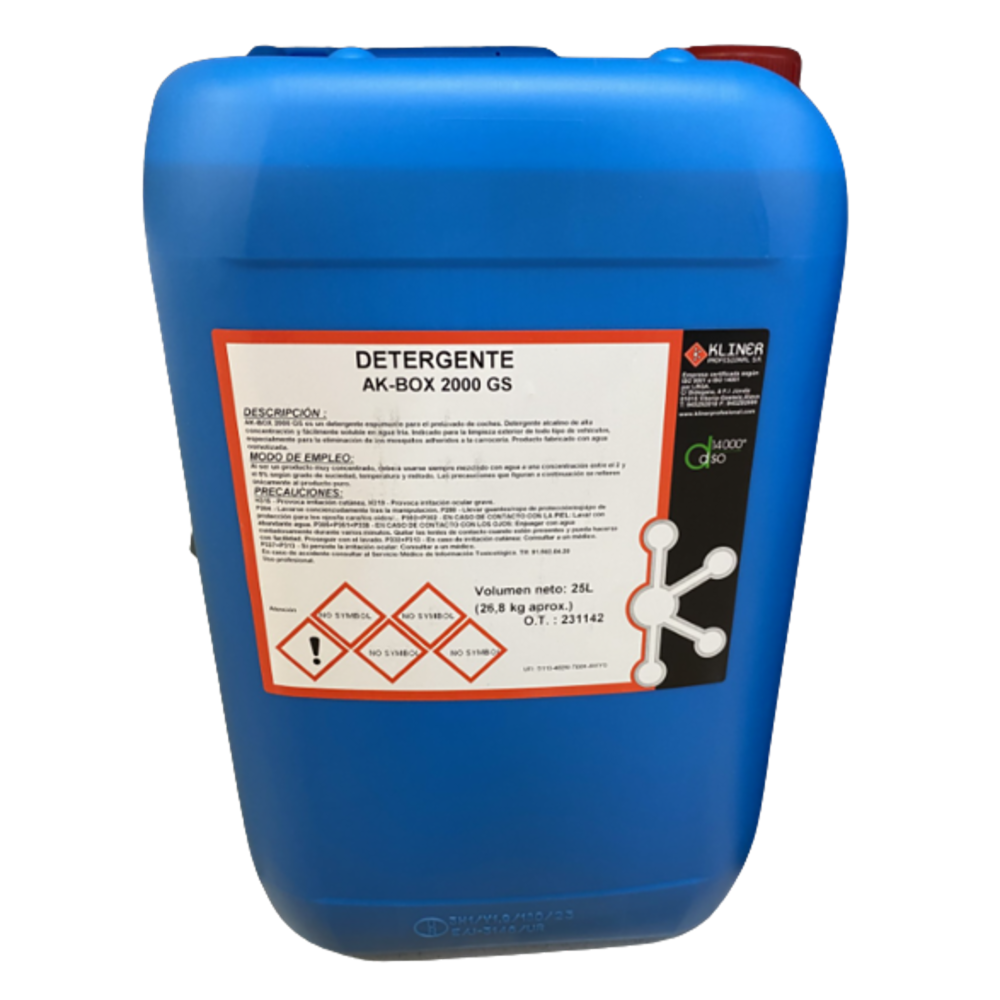 <>AK-BOX 2000 GS es u deegee alcalo de colo azul, efumado y fclmee><>soluble e agua. AK-BOX 2000 GS ha sdo esecalmee fomulado aa el lavado de><>vehculos e boxes.><>AK-BOX 2000 GS dsuelve oalmee la sucedad, evado el foado maual ejudcal><>aa la ua de las caoceas. Paa facla la oeac de lavado, se ha logado><>maee e u alo vel de esuma, a f de que el oeao ueda duae odo el><>lavado aeca el esado de la suefce del vehculo, co el cosguee ahoo de><>emo y de oduco.><>AK-BOX 2000 GS o aaca guo de los elemeos cosuyees de los vehculos><>(cauchos, comados, ec.).><>AK-BOX 2000 GS seca leamee aa da emo a lava odo el vehculo.><>No coee NTA, esoacvos cacos olfeoles eoxlados.>