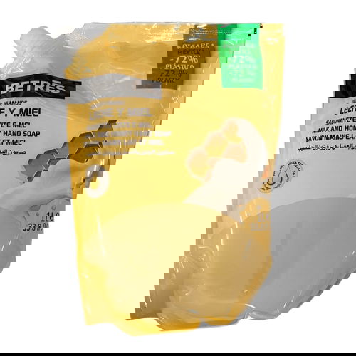 El jabón de manos Betrés Leche y Miel en formato recarga de 1L ofrece una limpieza suave e hidratante gracias a su combinación de leche y miel, dejando la piel con un agradable aroma dulce. Su envase ahorra hasta un 72?% de plástico, convirtiéndolo en una opción más sostenible para recargar tu dispensador habitual.