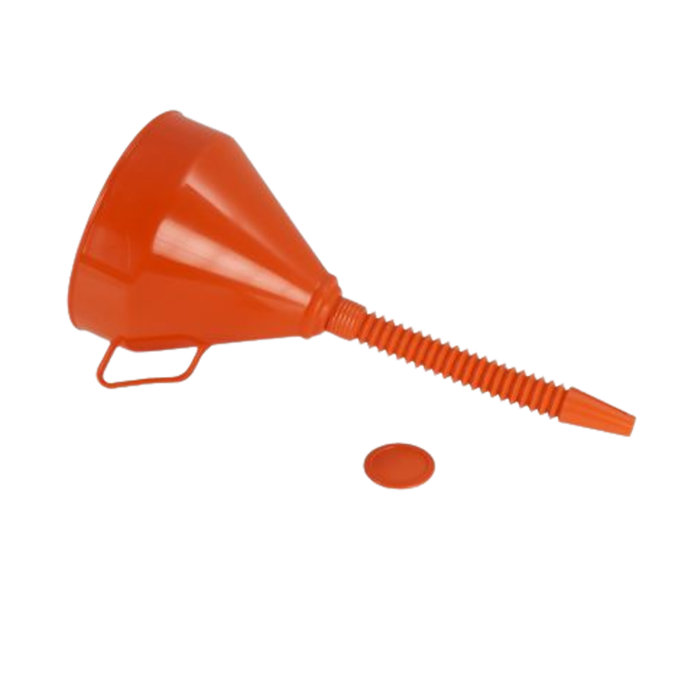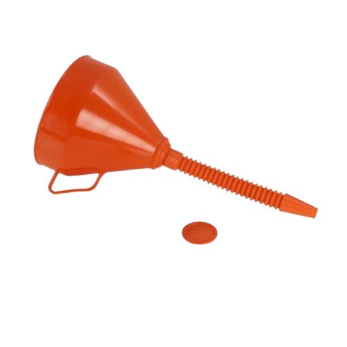 Embudo de plástico con pico flexible para usos múltiples y filtro de nylon. Medidad de la boca 160 mm.