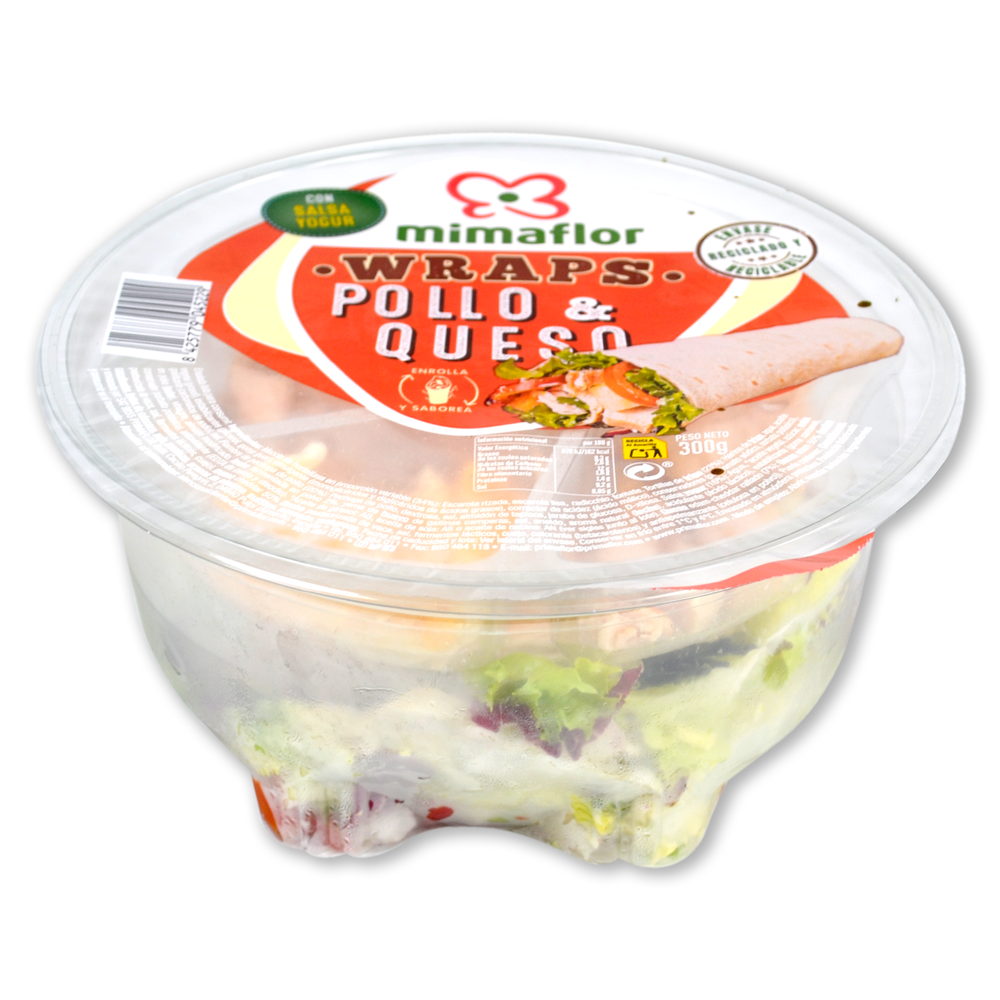 Deliciosas tortillas de trigo acompañadas de escarola lisa, radicchio, batavia verde, tomate, pollo, quesos Edam y Cheddar y salsa de yogur. ¡Para que disfrutes de lo más enrollado de Mimaflor!