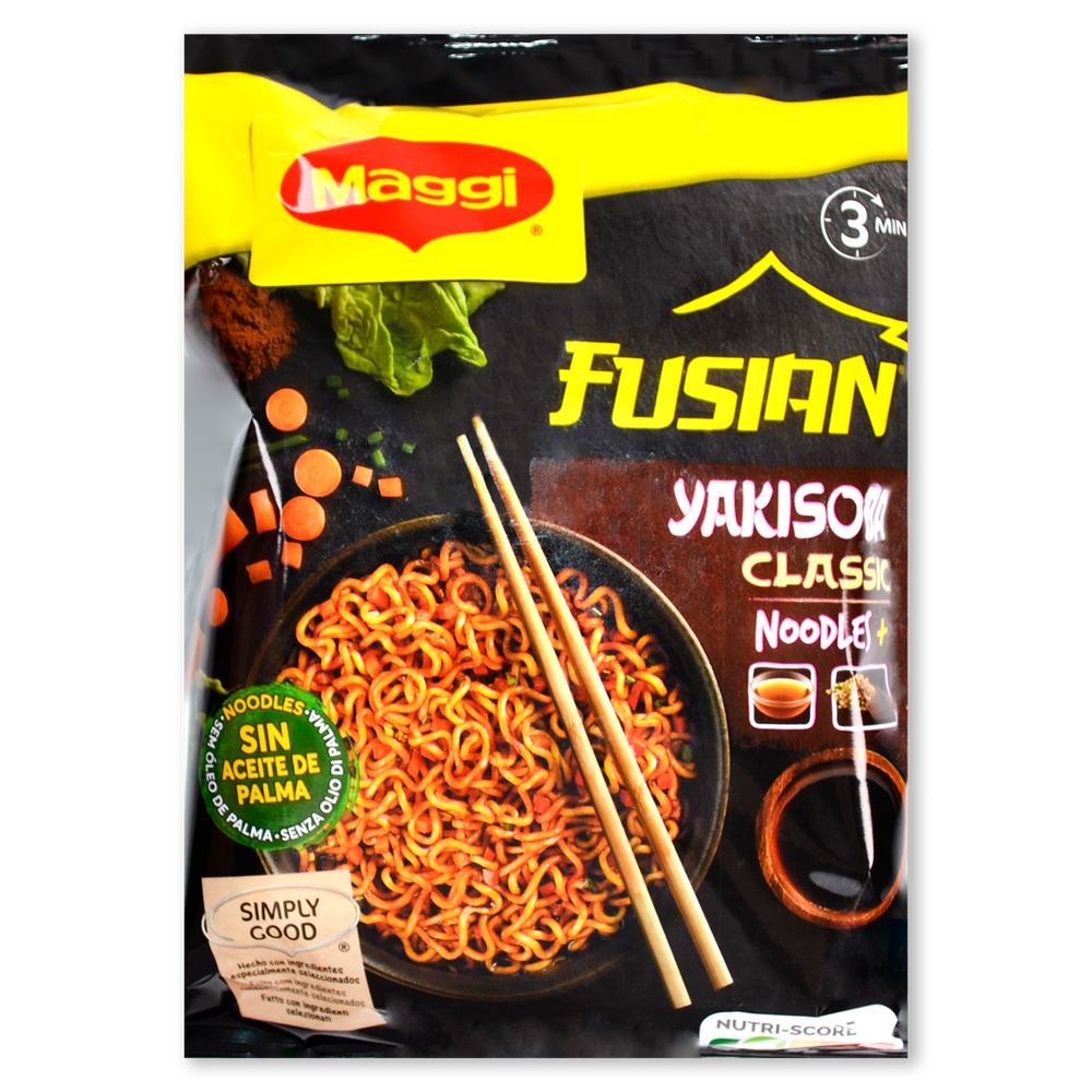 Con los Fideos Orientales Fusian Yakisoba Classic de MAGGI prepararás unos auténticos noodles asiáticos de una manera muy fácil y rápida en tan solo 3 minutos. Los noodles Yakisoba son unos deliciosos fideos asiáticos salteados con verduras deshidratadas, como la col, la cebolla y la zanahoria y especias. Se pueden preparar al fuego o al microondas añadiendo 1/4 de litro de agua en un recipiente con el contenido de la bolsa (fideos japoneses, especias y salsa de soja) y cocinar 3 minutos. Disfruta de la comida más popular de Asia de una forma práctica y rápida.