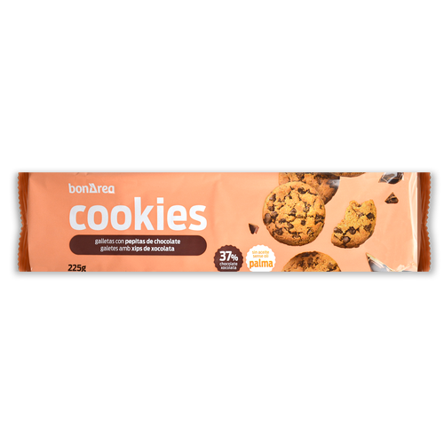 Galleta formada por una oblea circular hecha a partir de harina de trigo, grasas vegetales y azúcar, con trocitos de chocolate en su parte superior. Ideal para desayunos y meriendas, acompañada de los zumos o la leche bonÀrea.