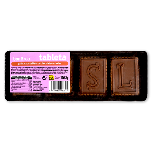 Galleta formada por una oblea rectangular hecha a partir de harina de trigo, grasas vegetales y azúcar, con una tableta de chocolate con leche en su parte superior. Ideal para desayunos y meriendas, acompañada de los zumos o la leche bonÀrea.