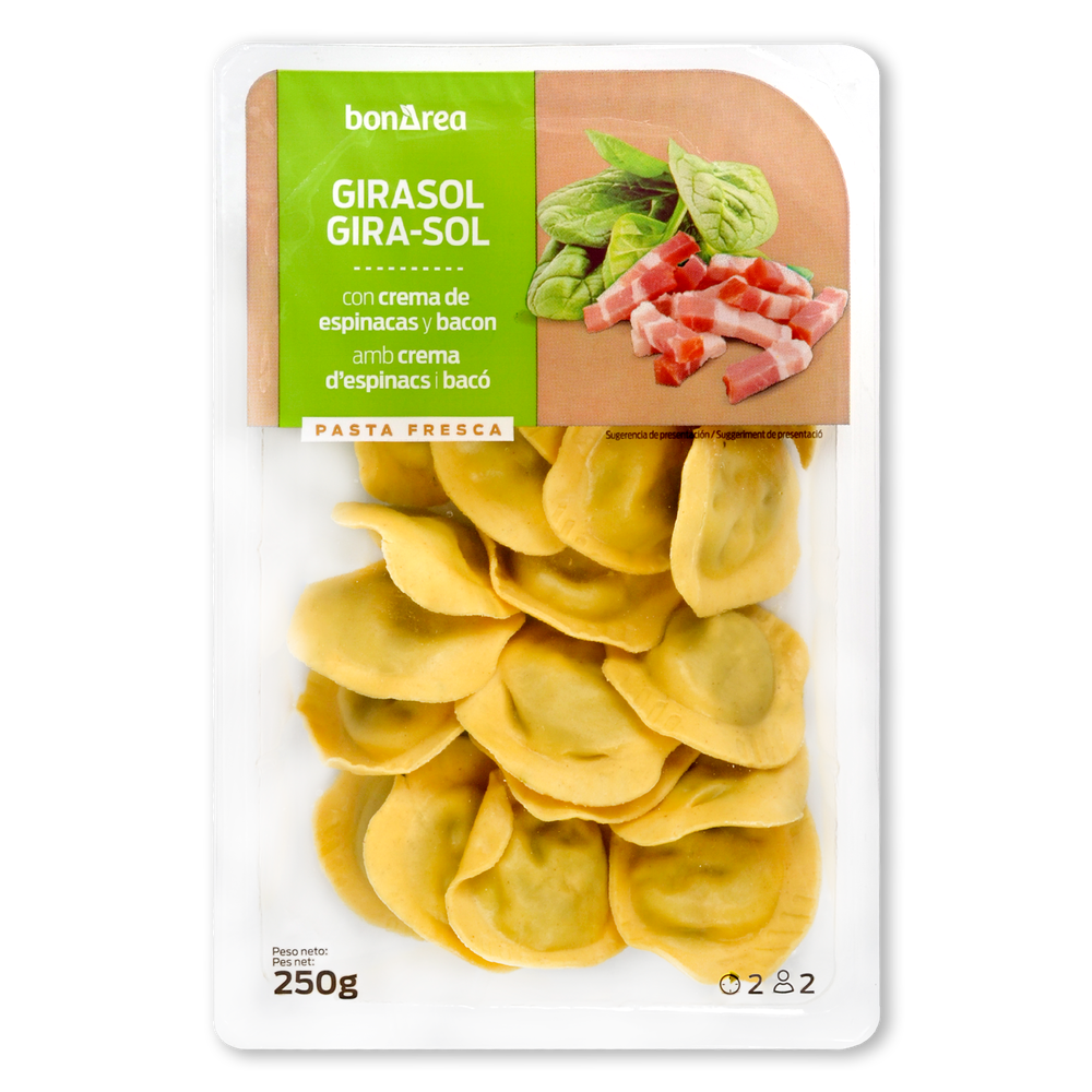 Presentamos un nuevo producto de pasta fresca al huevo rellena con espinacas y bacon en formato de sol pequeño, la combinación perfecta de verdura con carne. Además, con nuestras salsas bonÀrea se pueden combinar para presentar un plato exquisito.